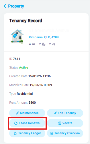 1) Open the Tenancy Record & click the 'Lease Renewal' button on the left hand side of the screen as shown below: