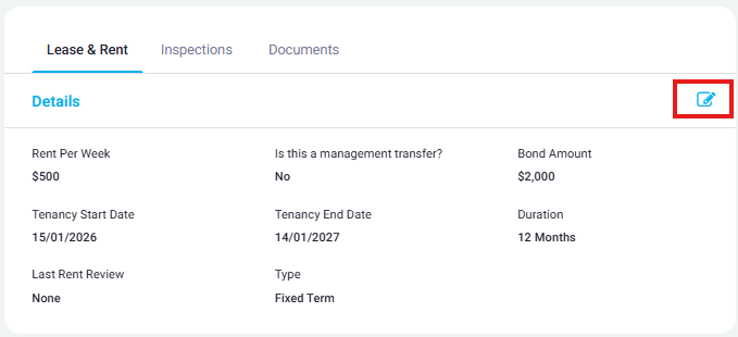 4) If there has been a rent increase or decrease in the lease renewal, you will need to manually update the rent per week amount in the tenancy record. To do so, click the Pencil icon as pictured below: